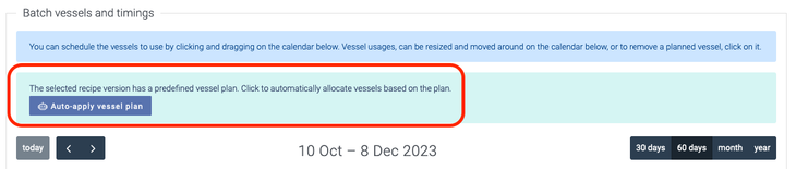 Now, simply create a brand new batch, and if you choose a recipe that has an associated vessel plan, you'll see a new option above the calendar view for planning vessel usage:
